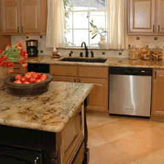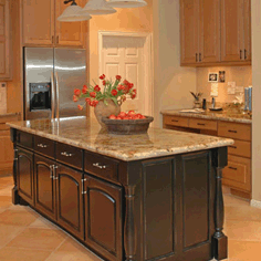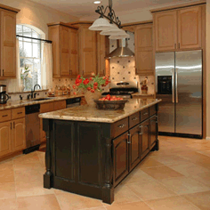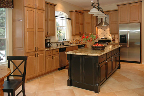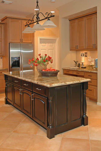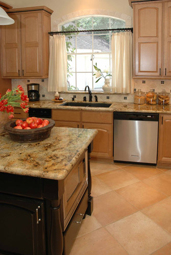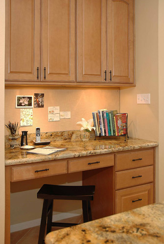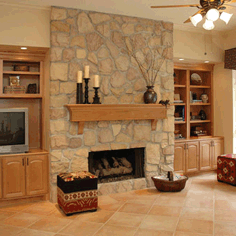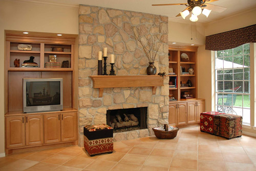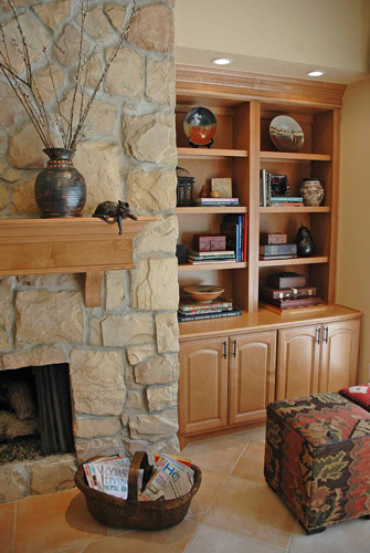 A warm, family-friendly space was desired in this remodel, with a new kitchen layout, new cabinetry, and beautiful stone fireplace.