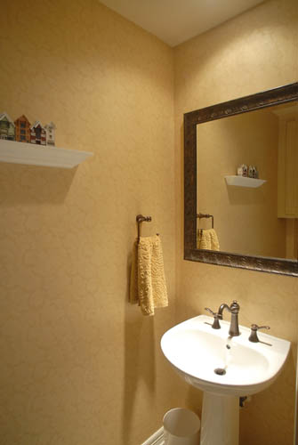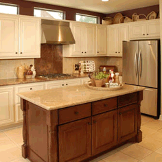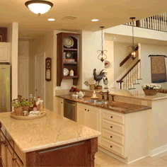 A "builder standard" kitchen gets an update blending the adjacent living room color palette and some French country style to create a unique, cohesive design.
