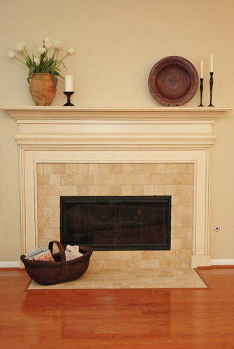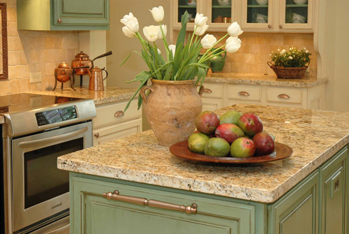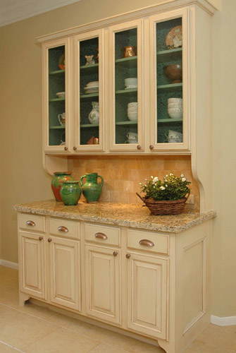A light, airy French country kitchen was created with a creamy, soft color palette and copper accents. Relocating the ovens, cooktop, and the pantry provided a better use of the space and created the striking focal point of the new custom hood.