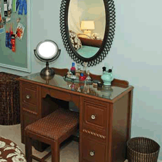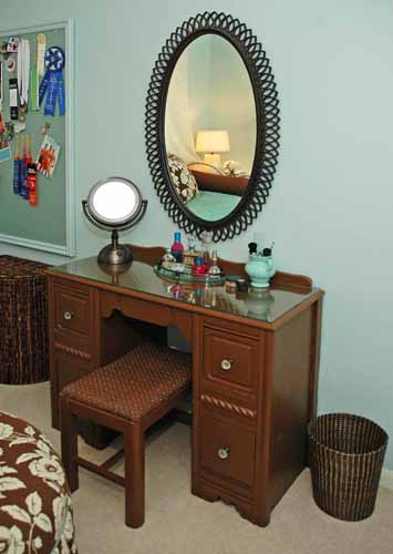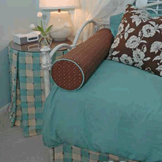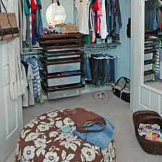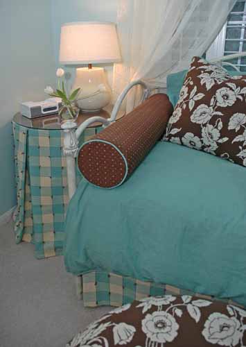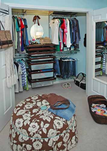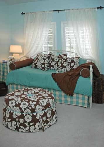 A cheery, comfy bedroom in a fresh, modern color palette was created for a teenager, reusing her childhood trundle bed. Lots of pillows and a custom ottoman add personality to the room and closet organization is a must!