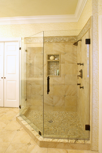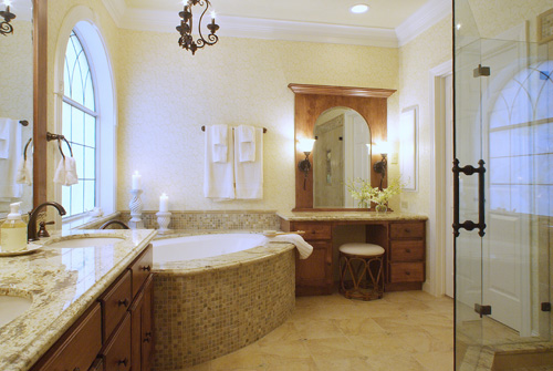 A luxurious spa-like retreat is created with a light, tone on tone color scheme and beautiful finishes. The glass shower enclosure and color scheme enlarge this master bath while the darker wood cabinetry and new, Palladian style window enhance the traditional feel.